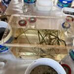 Nun ging die „Forschung” im Teich weiter. In Zweiergruppen bastelten wir in einem Unterstand zwischen den Teichen eine „Unterwasser-Lupe”, mit der wir das Leben unter Wasser in den Teichen untersuchen konnten. Wir sahen viele Schnecken, sogar Fische, Kaulquappen und Pflanzen.