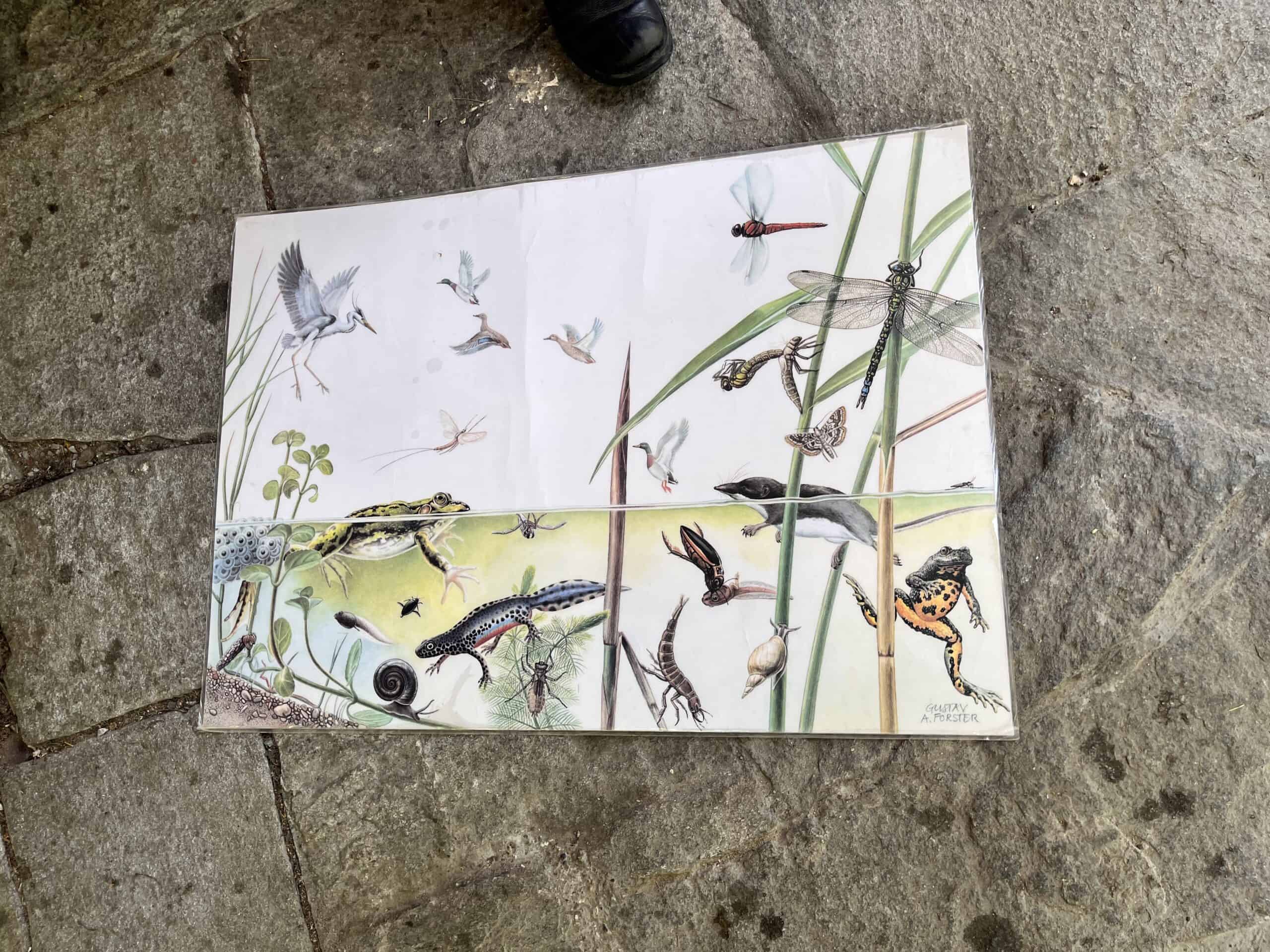 Zum Einstieg zeigte uns Nicolas ein großes Plakat mit verschiedenen Tieren und Pflanzen darauf. Zum ersten Mal testete er unser Wissen: Wir durften sagen, welche Tiere uns rund um den Teich bekannt sind oder die wir schon einmal gesehen haben. Monika und ich staunten nicht schlecht, als wir sahen, wie viele Tiere erkannt wurden. Da waren zum Beispiel Teich- und Wasserläufer, Molche, Libellen/Libellenlarven, eine Eintagsfliege, verschiedene Schneckenarten und ein Frosch dabei. Uns wurde aber gesagt, dass wir heute bestimmt nicht alle Tiere zu sehen bekommen werden. Das hängt von der Jahreszeit, aber auch vom Wetter ab.