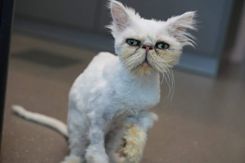 Grinch, ein sehr lieber, verängstigter Perserkater wurde total verwahrlost und mager aufgefunden und bei uns abgegeben. Wir mussten ihn komplett schären, so verfilzt war er. Sein Fell wird natürlich wieder vollständig nachwachsen.